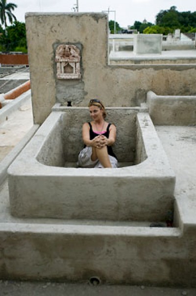 The other finish is called chicum, the Mayan name of a local tree. A chicum finish is produced by mixing white cement with the resin boiled from the bark of the chicum tree. This makes the cement water resistant and gives it a creamy, marbled appearance. Chicum was widely used by the Maya to seal the surface of their temples and especially their chaltun, which are cisterns for capturing and storing rainwater. The hacendados adopted chicum in the construction of their buildings, as well. Two famous examples are Hacienda Yaxcopoil and Hacienda Tabi. From these and other examples (including a plunge pool shaped like a chaltun that we enjoyed in our former colonial home), we learned that chicum ages gracefully and is a good way to preserve concrete that will experience a lot of moisture. We plan to finish several outdoor concrete areas with chicum, including the bathtub, seating areas, the pedestal for the bar and the rim of the swimming pool.