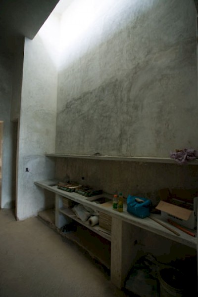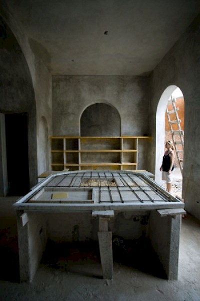A special delight has been watching the masons build the elements of the kitchen. One wall is covered with concrete shelves, finished in white cement with yellow pigment. The lower shelves will have wooden cabinets installed. The opposite wall has two long shelves with spaces for our stove and cabinets underneath. Above the spot for the stove, the masons have sculpted a large campana, a bell-shaped vent that is traditional in these colonial homes. Just steps from the stove is a pantry, with more shelves and two skylights. This is where we intend to hide the refrigerator. All in all, this kitchen will have more storage than any we’ve ever had.