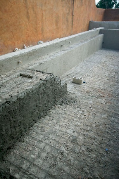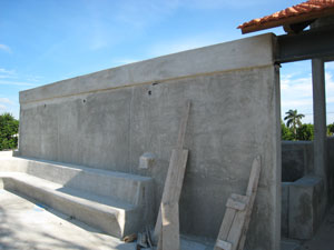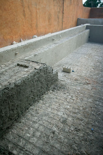 One of the required elements of whatever new house we were going to build was an outdoor bathtub, and we’re happy to say that this particular dream is coming true more beautifully than we had imagined it. Our bathtub is located on the terrace outside the master and guest bathrooms. It has been roughly shaped out of concrete block and then sculpted with layers of cement. We’ve designed an “infinity” tub, so it can be filled to the top, and overflow into a surrounding channel that will eventually be filled with white river rocks. Next to the tub is a lounge area for lying in the sun, or sitting and talking to whoever is in the tub. All of this will eventually be covered with a chicum finish, the same finish that will surround the pool and the outdoor banquettes.