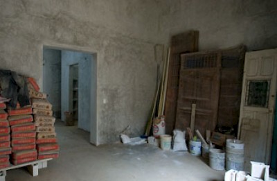 The floor is a checkerboard pattern of grey and white tile, and in the center is a generous island counter made entirely by hand using concrete. This is where the sink and small appliances will live. Two large doors open from the kitchen to a covered terrace facing the inner courtyard. Much of the actual cooking will take place on this terrace, since we have come to enjoy many Yucatecan meals that are prepared a la parilla (grilled) over a mesquite wood fire, like arrachera and cebollas. Hmmm.