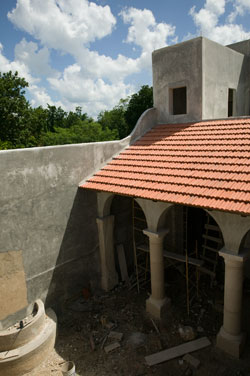 The tejeban over the courtyard terrace is supported by concrete columns and arches, but the upstairs terrace floor could not support this kind of structure. The architects had to devise a way to support the rather wide tejeban somehow, which they managed to do by using a long steel girder that extends from one load-bearing wall to another, a distance of about 30 feet. The girder itself weighs several tons and we were curious how the masons would lift it to the second floor and set it on the walls. The architects were curious about it, too. Nobody offered a solution. For three days the girder lay in the yard while we discussed other matters with the architects. Then one day we all arrived to discover that the girder was installed high on the walls of the second story, without any explanation by the masons. Our curiosity has not been satisfied and we remain puzzled. We are reminded of the Maya legend about the technique the ancients used for lifting the massive stones to build their temples: levitation.