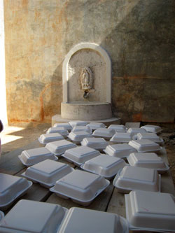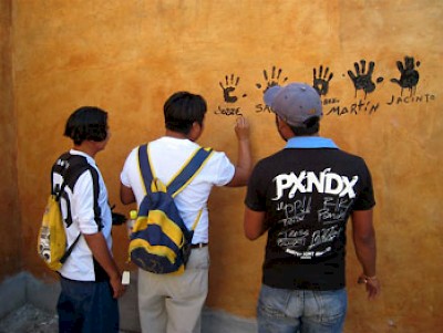 In an informal ceremony last week, we created a sort of monument on the wall behind the pool to the trajabadores (workers) who have built this house. We ordered lunch from a place we've found that delivers great lunches (Burrito Express, 926-7851...try it!). Forty burritos arrived individually packaged and labeled... an easy and tasty solution for serving such a big crowd. After lunch, we invited each worker (there were 33 of them) to put his handprint in black paint on our garden wall, and to print his name underneath. Our architects, our assistant Beatriz and we added ours as well. The result is a line of black handprints on our wall, reminiscent of the ancient Mayan handprints you sometimes find in caves in the Yucatan, and a meaningful tribute to the men (and a few women) who built this house.