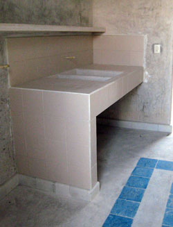 The laundry room has been completed (except for paint and actually installing the washer and dryer). We covered the sink with ceramic tile (which we don't particularly like and don't have anywhere else in the house) as we were advised that it holds up the best under cleaning fluids like bleach. We also installed a "Mexican-style" cement sink, as opposed to a "Yucatecan-style" sink. The Yucatecan style sink is rectangular, with a washboard-like surface on the bottom, and it tips to one side. We've seen them in the most remote pueblos and in the laundry rooms of some of the most expensive homes here. The Mexican-style sink is actually two side-by-side sinks, one for soaking and one with the built-in washboard bottom. Who knew? In any case, they were both available pre-made from the same concrete store that makes columns, molding and other pre-cast concrete and cement items. By the way, these cement items are very inexpensive. As we recall, the sinks both cost about $100 pesos (that's less than $10 US).