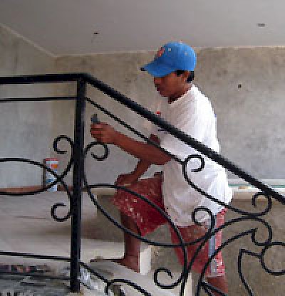 Our architects hired two different iron workers to work on our house. The doors upstairs facing the patio with the outdoor bathtub were done by one man, who did a markedly sloppier job than the other iron worker. His doors didn't seem quite as well put together, and when he installed his work, he made a lot of unnecessary holes in the walls. Upon observing that, our architects repaired the damage and gave the rest of the doors and windows to the second iron worker. His work has been neat, careful and consistent. In the past two months, he has built and installed bannisters for the inside staircase, the divider between the living and dining rooms and for the stairs next to the pool. He's also built the three arched iron doors leading into the kitchen and dining rooms, as well as the rectangular-paneled doors for the living room and master bedroom, which