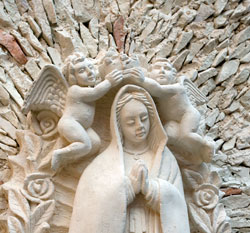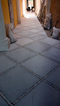 Speaking of rajuela, this is a word we learned because we employed it in a number of different places throughout the house. And if we'd had a few more months, Working Gringa probably could have figured out a few more ways to use it! Rajuela is pieces of limestone, chipped off in cracker-sized slices. The traditional way of using those chips is to embed them in cement, lined up in the same direction so that they form a nice pattern. The wall that the water falls down at the end of our pool is done in rajuela. So is the column of the outdoor shower next to the pool. And the arch above the fountain in the courtyard that houses our Virgen of Guadalupe statue is done in rajuela too... fanned out around the Virgen's head to look like a halo. But where we really won the rajuela sweepstakes (took the rajuela prize?) was in the concrete walkway outside in the pasillo. We didn't want to have a plain cement floor. We couldn't afford tile for such a large area. We needed to break up the cement into a pattern that looked both attractive and would allow for expansion and contraction, thus avoiding cracks if at all possible. We settled on a diamond pattern of cement squares (echoing the diamond layout of the saltillo tiles around the pool), separated by lines of rajuela. This sounds exotic, but it is quite common here in the Yucatan. It might be common, but it certainly isn't easy or, because of that, not particulary inexpensive. The rock doesn't cost much. The cement doesn't cost much. But the labor to chip all those rocks and then lay them in lines... well, in our case, that seemed to take months. And not for lack of people spending time on it, either. By the time the entire pasillo was finished with the rajuela pattern, we were sure the albañiles doing it wereready to ride us out of town on a rail. They were probably chipping rocks in their sleep for weeks afterwards. Despite the torture of creating it, however, the end result is lovely, and we're glad we bothered.