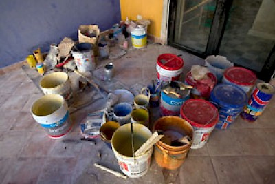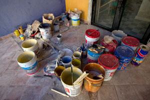 Run your hands along the walls. If a very fine dust comes off on your fingers, that probably means the walls are painted with cal paint. This is basically a form of very thin plaster with color added to it. While this type of paint allows the old stone walls to breathe, it also tends to stain and flake off. You should count on having to repaint every few years, depending on the humidity in your house. If the cal paint is on an outside wall, you will probably have to paint every second year to keep it looking beautiful. There are vinyl paints here, of course (called vinilica), and they can be used on any kind of wall. If you use vinilica on a mamposteria wall, you run the risk of bubbling as the wall releases its humidity over time. Vinilica on a cement block wall will last for a long time, as long as there are no humidity problems.