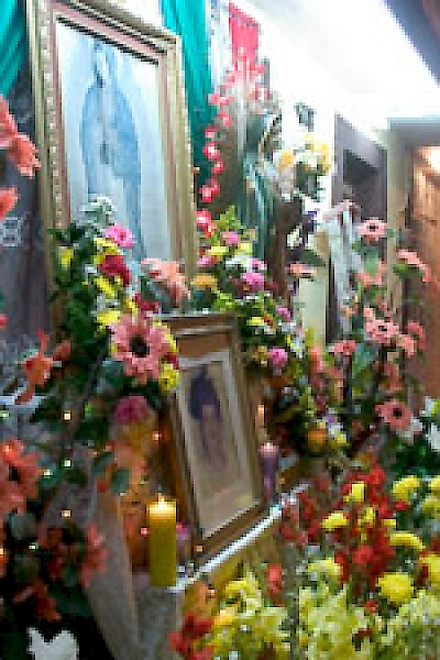 The festivities started several days ahead of the actual day. Individual families and neighborhoods held novenas and parties to honor la Virgen. Houses were decorated and whole streets were blocked off. Families prepared meals to share, decorated altars with as many flowers and lights as they could find, and brought out all their Virgen pictures, posters, statues and paintings. "Ven más tarde!" (come by later!), they would say to us, "there will be mariachis!" We never actually heard a single mariachi band, but since everyone was talking about them, we imagine they were all over town.