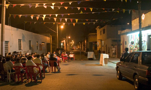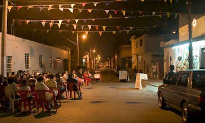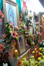 One gentleman we met was holding a novena in honor of his wife who had been dead for twelve years. Her picture was prominently displayed below the larger painting of la Virgen on his altar, which adorned the entire front of his home. When we saw him at about 5:00 pm, young men were setting up the sound system. When we came by at 10:30 pm, we had missed the mass held in front of his house and the procession where the statue of the Virgen was carried around the block. All the neighbors and guests were now sitting around, being served food by his daughters. One friend was handing out cold beers to anyone who wanted them. We couldn't wait around for the mariachi band that was due to show up at midnight, but the neighbors seemed very content doing just that.