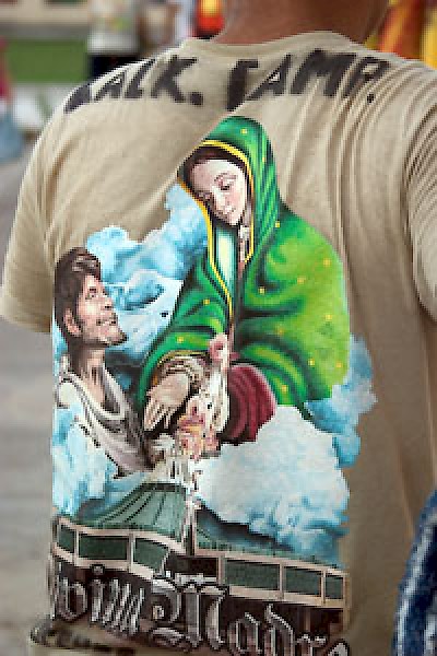 What we took away from these experiences was a respect for the real devotion and love Mexicans feel for this uniquely Mexican deity, and especially by so many of the young. With people riding and running from everywhere to everywhere, the events were a study in organized chaos. Probably the most exciting moment was standing in the crowd on Monday night in front of San Cristobal as white-clad nuns drove up through the crowd in a minivan. About six nuns with guitars stepped out and then the van continued through the crowd, followed by another car carrying a big glowing rose, draped with a Mexican flag and bearing a lit statue of la Virgen in the middle. Young men kneeled as la Virgen passed by on her float. As the crowd surged into the church for a mass with the singing nuns, we bought our Virgen memorabilia (tshirts, socks, hanging lights) and took our tired bodies home.