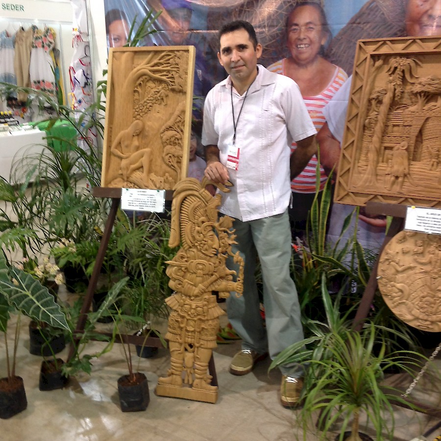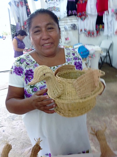 Some outstanding new artists this year include Andres Vázquez Paloma, from Oxcutzcab, who carves award winning bas-relief in cedar. As a young person he started drawing and then was drawn to wood carving. He is mostly self-taught and his work depicts in amazing detail the daily life in the villages of Yucatan. Another new artist, Alfredo Poot Dzib from Valladolid, will present his highly decorated jicara items... lamps, tortilleras and decorative pieces made from gourds. Rosalinda Couich Ramirez of Felipe Carrillo Puerto weaves charming baskets and animals from bejuco, a type of grass. Maria Esther Uitzil of Valladolid Nuevo weaves breathtaking woven shawls in many sizes and colors.