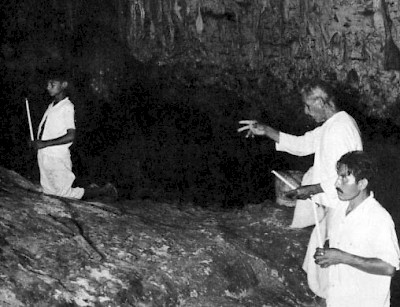 During the examination of the Balankanché cavern, one of the Maya workers mentioned to archaeolgist William "Willy" Folan that a Maya shaman or h-men from the nearby village of X’Kalakoop wanted to see the cave. Folan drove over and brought the h-men, Romualdo Ho’il, to Balankanché to meet with Andrews.
