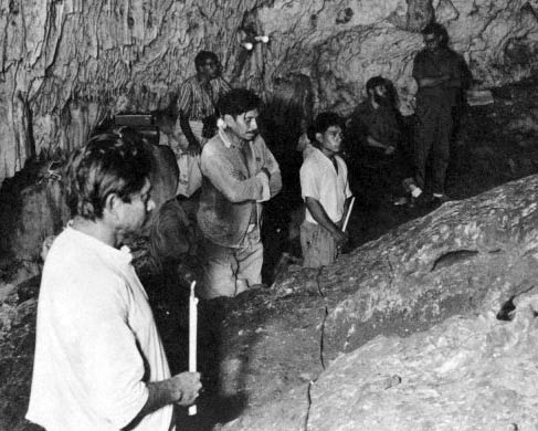 But on the appointed day at 8 a.m., the archaeologists joined Ho’il and thirteen assistants (including several boys) to spend more than a full day underground. Andrews and two members of his Dzibilchaltun team, Folan and Stuart, joined Mexican investigators Dr. Barrera Vásquez, Raúl Pavón Abreu, and Victor Segovia to witness the ceremony. Segovia (with Stuart’s assistance) operated a tape recorder during the ceremony.