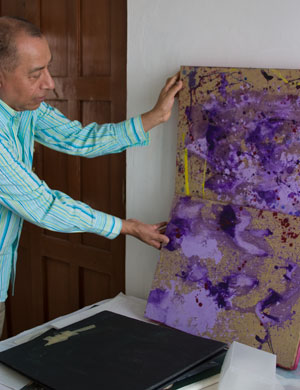 It is obvious that Benjamin is enchanted by color. Though he is the epitome of a reserved gentleman, we have noticed that he is always impeccably dressed... in color. When we walked with him through his garden toward his studio, he explained how the colors of the tropics have been so shocking and surprising to him. Benjamin still shows his work in Philadelphia and people have commented about the bright colors... "But look around you!" , he says, and his eyes light up. "Those colors are real here!" Indeed, as we walk past his glittering aqua blue pool, inset with darker blue glass stones, the green leaves are screaming green next to a yellow you could only find in a box of neon crayons. Then we walk into the shadows outside his studio door and see the subtlest of blues and purples reflected on the white wall. Inside his studio, Benjamin shows us some of his older works... huge canvases filled with patterns of light and dark blue, like the shifting shadows and light on the surface of his pool.
