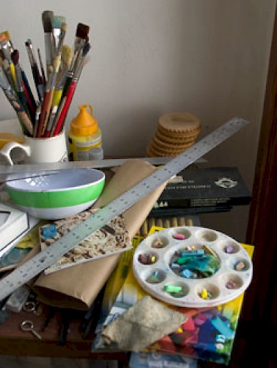 We're seeing colors everywhere, just like we see in Benjamin's drawings. Aaah, now we're beginning to get the idea. A brown canvas with different shades of purple pops out at us, defining a feeling of space that isn't really there. We're beginning to think that appreciating abstract art takes attention, a little bit of concentration and a willingness to let go of preconceived ideas of art. Perhaps these are some of the things that have attracted Benjamin as well, and provided him with the challenge that he so obviously enjoys these days. He's no longer providing healing and support to his corporate patients. Instead, he's diving in and letting go of restrictions and constrictions in a never-ending quest to express the experience of light and space.