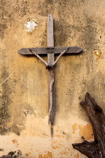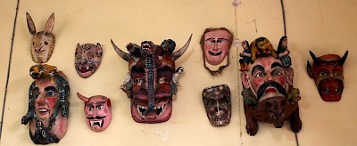 In the kitchen, the center of the house, a wooden kitchen table holds papers, food, pots and an energetic kitten. In the center, a group of sculptures that recall the Venus of Willendorf cluster nakedly on tiny pedestals, facing in all directions. We sit in the kitchen talking, but concentration proves difficult because the walls there are filled with art that Joseph has been collecting here in Mexico. Above one door is a drop-dead mask collection he tells us he found on the street one day when someone was throwing them away. These are vintage masks from around Mexico in fairly pristine condition, whose colors and primitive features seem right at home here. Another wall is filled with crucifixes, something there is no shortage of here in this Catholic country. Joseph's crucifix collection actually spreads to other parts of the house, and ranges from very traditional vintage versions to his almost modern crucifixes created from found branches.