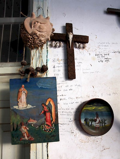 Outside, Joseph's working studio spans the entire length of the building, half under the open sky. Here are piles of carefully chosen rocks, some waiting to be carved and some already carved by time and just waiting to be presented. Everywhere, hidden between stones, piled on shelves and stuffed in boxes are pottery skulls. Inside the studio extends towards the front of the house. In the kiln on this day, we find three Virgins of Guadalupe. These are Joseph-style Virgins, whose faces are not beautiful and whose lines are not fine. When we return a few days later, these Virgins are adorned with white paint, surrounded by gold-painted flames and the faces are still rough, ancient and evoke both pain and wisdom. The horns of the moon on which she stands look a lot more like horns of an animal. This Virgen is powerful, magical and more discomfiting than comforting.