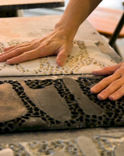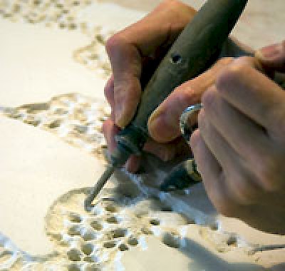 Encouraged by her results, Katherine's experimentation took two directions. She experimented in materials and techniques, while simultaneously experimenting in shapes, concepts and design. Her kiln wasn't large enough to hold the pieces she had in mind, so she began with concrete, learning the recipe from an albaƱile, and expanding upon it. She experimented with sand, ground stone and even saskab, a stone ingredient the Mayans used in building their monuments. She bought her own cement mixer, and experimented with formulas and mixing techniques. When cement proved to be too brittle for the large but delicate pieces she had in mind, she experimented with old newspaper, ground shells and other materials. She eventually turned to resin, adding in cement, saskab and pigments to expand her options for texture, color and finishes. The resin she works with now is not as ecologically friendly as she would like it to be, because it can be dangerous (she wears a gas mask to avoid inhaling the resin dust when she works). But resin provides the lightness and flexibility she needed to create the large, lacy structures that she envisioned.