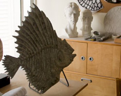 She came back determined to make art her job. She set up her studio in the back of her house, took correspondence courses from the Academy of Art in San Francisco, and started working. The project for the park had piqued her interest in fossils, and the months in Europe had sparked a fascination for the impact that historical records have upon living people. She started working with a Cretaceous fish fossil from the pycnosteroididae family. The fish had died out in the Cretaceous era, 144-65 million years ago, and had left no descendants. The fish itself had originally been very tiny, only 4.3 centimeters long, but when she enlarged the fossil and recreated it in concrete, she was struck not only by its primeval beauty but by its journey. An imprint of its skeleton was all it had left behind, and yet, here it was again, an idea being brought back into existence. Lifted from its surroundings, isolated and enlarged, the fossil was bizarre, primitive and ghostly.