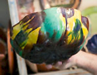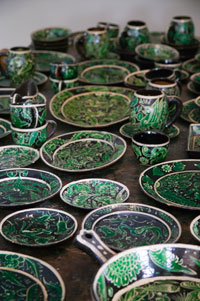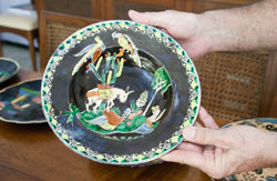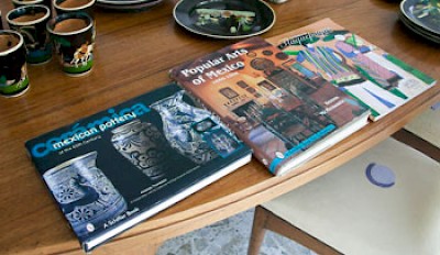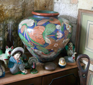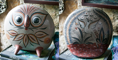 Paul has a vast and varied collection of these plates, most of which are not expensive to purchase, but the best of which can cost upwards of $100 a piece. He has only been collecting Mexican pottery, however, for ten years and says it is easy to do and incredibly fun, precisely because you can find it in the most random places, and it is not an expensive hobby... at least, not at first. In Merida, he says, the easiest things to find are Oaxacan dripware, recognizable by the large splashes of green, blues and reds, Michoacan piñas (pottery pineapples, usually dark green but sometimes blue or brown), patamban dishes in green and black animal and floral patterns, and the Tonalá burnished ware tiles, pitchers and animal figures (both pictured earlier in this article).