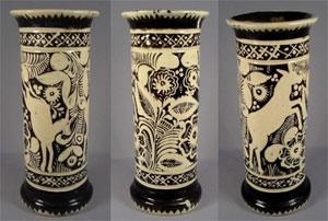 The pottery she creates are museum reproductions, and the designs copy the bas relief figures and styles of the Mayan paintings and steles found in the archaeological zones around the Peninsula. The beautiful and quite large vase pictured here on the left is from that area and stands in the entrance of Hacienda Chichen, a hotel next to Chichen Itza. The workmanship of these pieces is exquisite. Patricia and her brother mix their own clay, they make all the stains from minerals themselves, and they burnish the pots with polished stones to make their vessels and plates look like polished wax. In addition, these pots are not thrown, but made from coils. In fact, these museum reproductions are so well executed that they must be signed so that people are aware that they are not buying the real thing, but a reproduction of an ancient design.