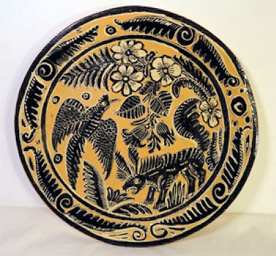 But, back to touristware. There are three colors of touristware plates and other pottery: red or terra cotta, black, and yellow or green. According to Paul, black is the most desirable as it is the most dramatic and many think, the most beautiful. In addition to the variation in colors, there are variations in glazes: night, fantasía, petatillo, grained and molded. "Night", as it sounds, refers to pottery with nighttime scenes painted on them, usually with stars in white on a black or dark blue background. "Fantasía" usually portrays animals (rarely people) in a sort of surrealistic way (A fantasía plate is pictured at the beginning of this article). "Petatillo" refers to a style of crosshatching that forms a background or texture to parts of the picture and is difficult to do well; therefore it is more valuable to collect, and the finer the lines, the more valuable the work (an example from Paul's collection is pictured to the right). "Grained" glaze has multicolored dots over large areas, and "molded" is the term used when the clay has been pressed into a plaster or wood mold to create the piece.