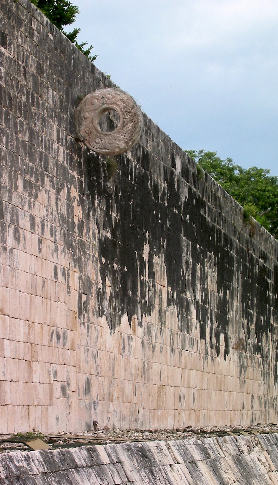 As she trod northward along a fine street paved in crushed stone, shout from a sunken court off to the side rose upward, mingled with the shouts of onlookers on the broad stone paving that surrounded the place. Unresisting, she was swept sideways along this street, with a mass of other travelers who seemed determined to see what they could of the excitement going on down below. Now and again, when bodies shifted, she wriggled her small self forward, looked down for all she was worth, and thrilled to what she saw. Ehen! But thhis must be tlaztli, that strange game from Tenochtitlan that the Aztecs brought with them into Yucatan. And what a place they had built to play it in -- a grand paved court a hundred paces long, with walls fifty hand-spans high. Almost at the top of each end-wall, there projected forward over the court a huge ring of carved stone. Across the game ground itself, swarmed two teams of players wearing nothing but their hip-length kilts and headcords. One band wore red head-cords, the other, green. Now the "Greens" had the great rubber ball, now the "Reds". A point in the game seemed to be for a player to catch the ball on his hip and bounce it in the desired direction. Another point was to hurl the ball upward so as to pass through one of the high-set stone rings.
