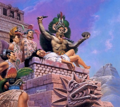 As the palanquin progressed, it passed beyond pleasure place and palace, and on into the gloomy grandeur of the templed section of the city. Here a vast architectural complex of colonnades enclosed a many-acred central plaza composed of pyramid-temples, towers to the sun-god, sunken courts, terraces. This whole spacious group of religious buildings dated back into the glorious past when Chichen had been the holy city of the old Mayan empire. But, since the turn of the wheel of fate had brought Chichen under the heel of the foreign conqueror, these ancient buildings -- formerly dedicated to the peaceful rites of the Mayas -- were now remodeled into places of worship of the conqueror's terrible gods. Thaloc the Insatiable, and bloody Huitzilopochtli now ruled the altars within. To exteriors, the priesthood added weird sculptured adornments in honor of Kulkulcan, Feathered Serpent, the strangest god in all the dread host of the Aztec pantheon. On columns, balustrades and cornices were cut representations of the Feathered Serpent until his sinuous trail was set like a blight upon each of the one-time Mayan temples.