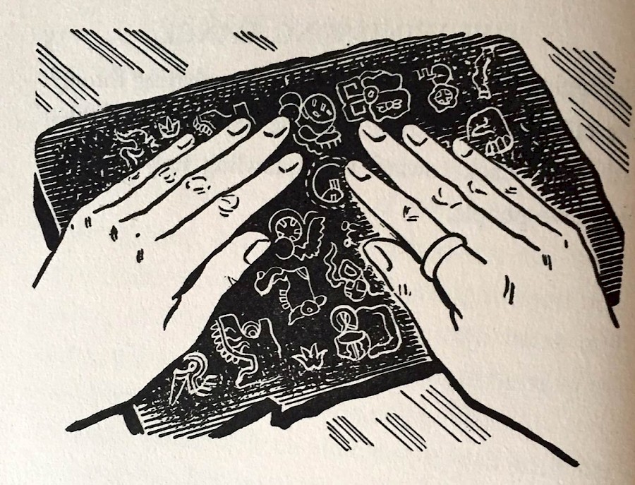Silently, the girl watched the unkempt procession depart. Then, with a sigh, she picked up the leather bag and dropped it into the basket, retrieving her scattered herbs and roots and packed them in on to of the leather. She knew without looking what the bag's contents were, merely more of the broken fragments of stone tablets bearing inscriptions in the old, now-forgotten Mayan priestly script. So useless they were, and a burden to carry. But because her grandfather set such store by them, she would take them home. She sighed again as the stone fragments rattled together when she lifted her load. These things were going to mean much extra work for her. Her blind grandfather, after their day's hard toil was done, would pore over these stone-engraved hieroglyphics, reading them with his finger-tips, searching always for some lost Mayan record that never could be found. And with just such a queer assortment of textbooks as these broken inscriptions of a lost written language, the old man was forever teaching his granddaughter to read and write. A stretch of smooth sand before the hut door served as a tablet. Here, with a stick for a stylus, Nakah thought she must have copied enough of the ancient glyphs to encircle the whole great temple of Huitzilopochtli.