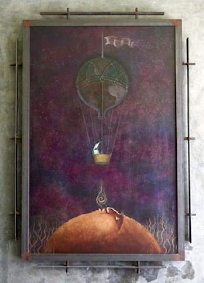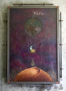 Of course, we loved Samuel's art the minute we saw it. We were captivated by the tiny brush strokes, the attention to detail, the whimsical metaphors and stories told by each painting. Our first favorites included huge turtles, painted like planet Earth, floating in a star-strewn sky, tied with twisted rope to balloon baskets swinging below, with a pie-faced moon looking on calmly from one corner and a placid but fiery sun watching from the other. When we finally met Samuel, our first impression was that he had stepped out of one of his own paintings, as small and finely detailed as they are, with a whimsical arch of his eyebrows and a ready smile that mirrored the feelings his paintings convey.