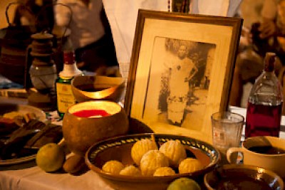 Nowadays, during the period of October 28 to November 2nd, in most homes, the focal point of the tributes is an altar -- erected on a cloth-covered table. It is festooned with photographs of the dearly departed, and all manner of items that will comfort, feed and nourish the traveling souls, including a wash basin and soap for freshening up. There will be zempasúchil (marigold flowers), copal incense, candles and perhaps trinkets they may have loved during their time on this plane. Sometimes they'll make a trail of marigold petals leading into the house to the altar, or here in the Yucatan, a cross on the floor in front of the altar made with marigold petals and chalk. The room might also be decorated with implements or tools the deceased may have used during their lives. Drinks for children, such as horchata – the almond rice milk, or chokó sakam, a protein rich, thick beverage made from maize will be served alongside bottles of Tequila and Mescal for the adults. Tamales and Pan de Muerto (a fragrant egg bread) are traditional food offerings as well as candied delicacies like sugared skulls. Of course, the favourite snacks of the deceased, themselves are ever present, so you may see all kinds of strange things on an altar.