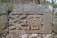 As the moon goes through her waning cycles, Ixchel ages and empties her jug onto the earth. As an old woman she sits at a loom and weaves a skirt with a pattern of crossed bones. This pattern is another decorative relief common to the stones of Uxmal. When Ixchel dies, dragonflies sing over her for 183 days.