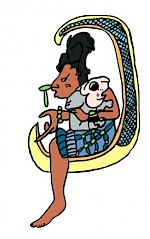 As the moon waxes and wanes, Ixchel transitions from maiden into mother and finally crone. She often carries a jug, which she continually empties onto the earth as the rains pour and the crops grow. She also wears a snake in her hair--an ancient symbol of wisdom and medicine; she understands illness and caretaking. She is the village medicinewoman. There are many statues of her as goddess O in Cozumel or small ones for personal altars.