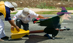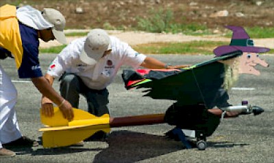 Radio Controlled Aircraft apparently come in all sizes and prices, from small electric ones that can fit in the palm of your hand, to gasoline-burning scale models which can be half the size of their full-scale "real" counterparts. Here in Merida, most pilots fly sport airplanes ranging from 40-size trainers to 120-size aerobats (going from 65 to 80 inches wingspan and 5 to 15 pounds), which are apparently the predominant sizes in the United States as well. The day we were there we were also treated to the flight of a RC helicopter and a RC witch-on-a-broomstick!