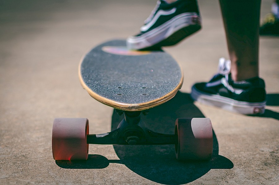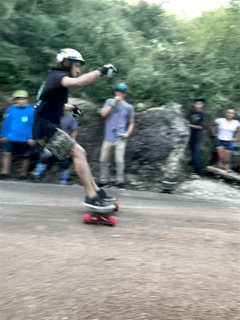 Click on the picture at left to see this rider in a long power slide. They actually turn the board perpindicular to the road and grind the wheels SIDEWAYS to reduce speed. It's fast and requires guts and coordination.