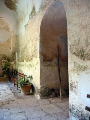 There's also a very lovely and large church in Mani (see the first photo). The altar and the interior have recently been restored, and they are quite lovely and worth seeing. Attached to the main church is a monastery building where I'm sure monks and friars once lived while they were doing what Mani is *most* famous for. It is barely inhabited now... the huge rooms and patios with stone floors, the wide stairs, the thick arched walkways are all very still and a little eerie on a quiet Yucatecan afternoon.
