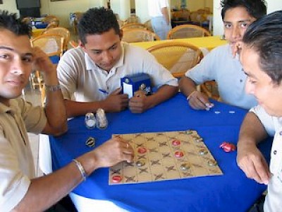 We breakfasted at Hacienda Temozon, one of the Starwood haciendas. Going there for breakfast allows you to soak in the elegant ambiance without having to pay the price to stay there. We had a lovely breakfast and then drove back into Merida and then on to Progreso. The weather was just perfect, and the beach was inviting. The city of Progreso has really improved things along the malecon (the walkway along the beach). The restaurants are all looking nicer, cleaner, more modern and even... dare we say it?... hip (some of them). There were a lot of new palapas on the beach, and a smattering of visitors enjoying their beers and totopos (tortilla chips). There was even this cute group of waiters, playing checkers with Coca Cola and Sol bottle tops while waiting for the lunch crowd to arrive. We noticed that Progreso now seems to have beach-cleaning equipment because the entire beach had been raked and cleared of seaweed. Walking along the beach in Progreso is now a more pleasant experience. We're looking forward to going back there for lunch someday soon.