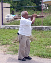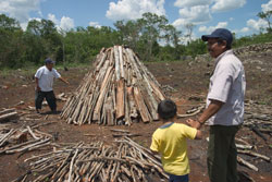 Later, we moved on to another part of the field, where the men explained that they were setting up to make carbon, or charcoal. We were amazed to see a structure worthy of Andy Goldsworthy: A perfectly shaped and painstakingly constructed cone sitting in the middle of the clearing waiting to be covered with chicun (red-colored) dirt and set on fire. According to the Mays, it will burn for 72 hours, smoking like a volcano, and then they will disassemble it, let it cool and then sell it as charcoal. It took them about three weeks to clear the land and cut down the trees they used to build the structure.. It will take another week to burn it, chop it and bag it. Then they will take it to market, earning about 2500 pesos (less than $250 US) for their troubles.