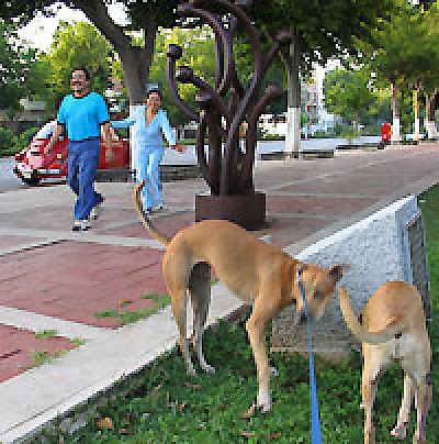 Usually, we see at least one or two of the other regular dog walkers along our way. There's Lia and Mario, a Canadian couple originally from Belize who have lived all over the world thanks to his job with Bechtel, and who have settled here in Merida for retirement with their three dogs Cocoa, Blanca y Negrito. Then there's Lynette, a retired former stock broker from New York City (when being a female stockbroker was unusual) who walks her dog Susie. The day we brought our camera, we even saw Melva and Abel, two artist friends who moved here from Mexico City last year and who, like a lot of people, walk along the Paseo for their morning exercise. There's also some regular street dogs, the most consistent of whom we call Abuelo (grandfather). He's obviously old, a kind of shepherd mix, and though he wants nothing to do with us, he seems to be much loved by all the workers along his route. He sits in front of the Hotel Montejo like he owns the place sometimes, but eventually he saunters up to the mercado at Parque Santa Ana for a meal of handouts and scraps. He would be right at home in the Disney movie, Lady and the Tramp.