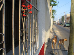 After saying hello to our memories of Panzer, we walk back home through the streets of Merida. By this time, mothers are walking their small children to school and older students are gathering in tendejons (corner stores) buying snacks before going to class. Most people who pass us on the street try to avoid the dogs, and Working Gringa often finds herself assuring them no muerden! (they don't bite). The dogs are very friendly and are sure that everyone they meet is hiding a hot dog somewhere, which tends to scare some people. URL barking at them trying to get them to hand over the hot dog doesn't help, of course.
