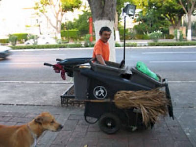 Farther on, we pass the Cafetería Impala with its hip 60's era signage and begin our walk along the Paseo. Every morning we see Juan, one of the city-employed men who spend their days sweeping up the leaves and trash along the Paseo, doing their level best to help the city earn it's reputation as the cleanest city in Mexico (we have our reservations... but we acknowledge that Juan works very hard. It's just that the rest of the population discard a lot of garbage on the street, and the trees shed a lot of leaves so Juan and his mates have their work cut out for them). One of the only obviously homeless men we have ever seen in Merida sleeps on a bench along the way, and if he's awake when we walk by, we wave and chat. He's a kind older man who always has a smile for the dogs. On the next block, we say Buenos Días to Jorge, an immigrant from Michoacan who likes dogs and who works as an albañile in a high-rise hotel that is being renovated.