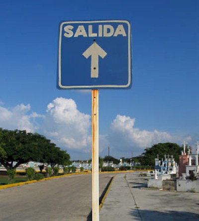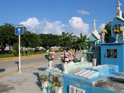 And so, Snra. Una made her salida (exit). Adios y buen viaje, querida! As we walked outside and sat on a bench, taking in the multicolored cemetery display with its spreading flamboyanes trees, we marveled at how strange life is and how totally pedestrian death can be. And how comfortable and close Mexicans are with death and dying. In Mexico, death is not hidden or closeted. Cemeteries are little towns painted in bright colors where the dead come to visit the living and where the living come to pay respects to their dead, bringing flowers (plastic ones last longer), liquor, coke, fotos and anything else that might bring a smile to their departed faces. Cemeteries are cheerful places in Mexico and every town seems to have at least one.