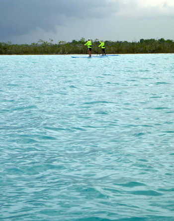 In less than an hour we are entering the narrower channel and the water almost explodes with color. The two teams have their rhythms established and are making very good time. There is no wind to speak of and no waves. Between the sun, the angle of the light, the shallow water (one meter) and the white bottom, it is color therapy to be just here.