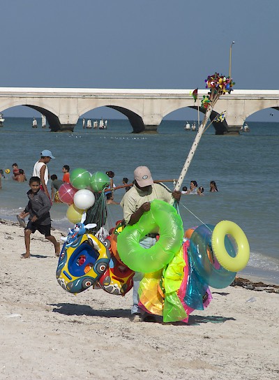 Carlos offers the Banana for rent for about three dollars to any person who wants to jump on it for a few minutes. Three dollars is good for a wild ride across the shallow waters of the Gulf of Mexico off this popular beach on the north side of the Yucatan Peninsula.