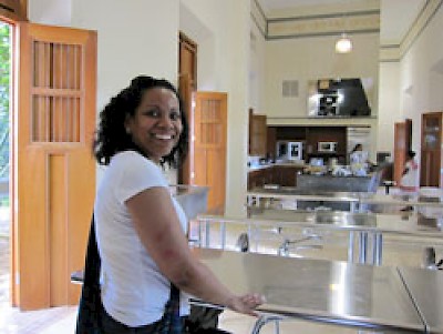 Out under the painted ceiling and in front of the magnificent mural, lunch was served, accompanied by all the handmade tortillas that were NOT made by our band of beginners. We also feasted on cochinita pibil, guacamole, beans, pork ceviche, fresh peppers stuffed with crushed pumpkin-seed dip for the crisp totopos (tortilla chips), all topped off with wine, soft drinks and those ever-present Coronas.