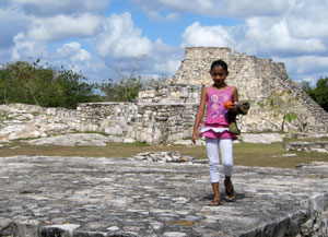 We climbed the Castillo there and were treated to a view of the surrounding countryside as far as the eye could see and a cool breeze, reaffirming our personal suspicion that the rulers built these pyramids as primitive air conditioners, to get out of the heat of the jungle. We climbed inside the Observatory, a smaller version of the Observatory at Chichen Itza. Between the two is a cenote which we could not climb into, much to our dismay. Instead we were rewarded with views of stucco sculptures that had been uncovered on the sides of the pyramids. Julia explained to us that these sculptures probably represented the afterlife and that the holes where their heads should have been were found full of the bones of human skulls. Neat!