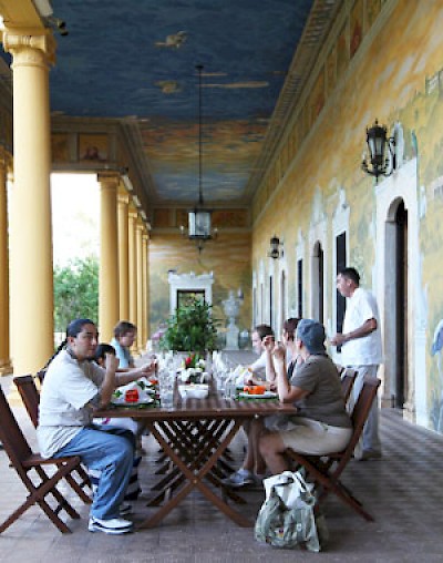 When the van stopped, we were greeted by resident workers with cold glasses of jamaica, that slightly sweet red drink made from hibiscus flowers. We were given a tour of the hacienda, which has been lovingly and completely restored as a private house with fourteen bedrooms and bathrooms, two swimming pools, various and sundry sitting and common rooms and a modern kitchen. The oohs and aahs continued as we looked at the original wooden pumphouse with the original pump inside, the lovely and well-kept gardens, the stone steps leading to a hilltop with a surrounding view and the simple, but elegant chapel. We were all imagining weddings there by the time we were done… but weddings aren’t the only thing that happens at Hacienda Itzincab. We were told it has been used for family reunions and we also recognized it as the site of a telenovela we once watched. We felt fortunate that we were able to see Itzincab again and enjoy the beautiful surroundings, but lunch was awaiting and it was time to move on.