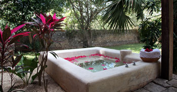 Both of these buildings have a view of the chapel, a perfect replica of a Roman temple. Covered with an authentic chicum finish, the chapel is magnificent and delightfully out of place. Its clean and classical lines lend an air of magic and mystery to this hacienda… as if the whole thing is just a dream. We don’t know about you, but we find it easy to imagine a barefoot wedding in this dramatic building, complete with flowers and candlelight and music. You don't find this kind of romance just anywhere!