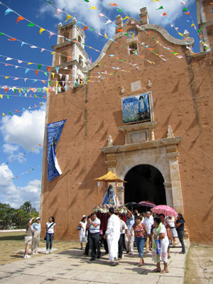 Our next stop was a quick visit to a private hacienda owned by Roberto Hernandez, the man who has done more than any other individual to revive the fame and beauty of Yucatan’s haciendas (and one of the owners of Catherwood Travels as well). Run as a private rental, Hacienda Itzincab is located near the lovely town of Tecoh. On a whim, we asked to stop the van so we could look at Tecoh’s lovely church. It was our good fortune that just at that moment, a procession of the saints of that church was emerging from the front door. The wooden effigies were being carried by beautifully-attired townspeople and would be paraded around the block and brought back to their places, where they would rest for another year.