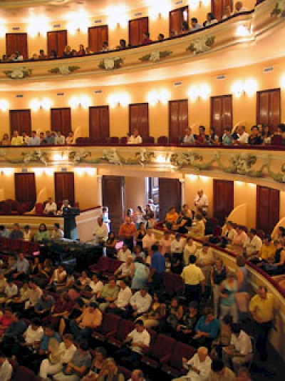 To stroll past this edifice near the main plaza on Calle 60 is to be reminded of the many palazzi (palaces) in Florence, while the interior is reminiscent of Italian opera houses like La Scala in Milan. An original touch is found in the faces of the putti, or cherubs, that adorn the mezzanine. Each has a distinctly adult face that seems to be a caricature of an historical person. Some even sport derby or bowler hats. There's a mystery here we've yet to solve.