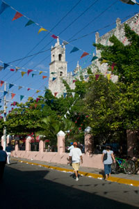 One of the oldest colonias in Merida, the Santiago district is to the west and north of Plaza Grande. The church, founded in 1637, was once much grander; now little remains of the original structure other than the modest sanctuary with a baroque statue of Santiago and the dated inscription above the entry. The front of the church and the main nave, supported by buttresses, not necessarily flying, was built in the 19th century. There is a park in front of the church and a market next to the church, with fruits and vegetables, meats, and a good flower selection. There are also a host of excellent cocina economicas, sundries stores and an ice cream store. There is also a children's playground in the park, a beautiful water fountain surrounded by shade trees, and a large concrete area used at various times for skateboarding, big band music (every Tuesday night!), dancing, fairs and temporary markets. Surrounding the park you can find a grocery store, a drugstore, a movie theatre and a branch of Mexico's pawn shop chain, Nacional Monte de Piedad. Behind the church are a number of hardware stores, paint stores, a bicycle store and Flor de Santiago, a bakery, a milk store, a cafe and restaurant. And on the other side of Calle 59 are two large schools, one public and one private, in beautiful buildings both built during the Porfirio Era (early 1900s).